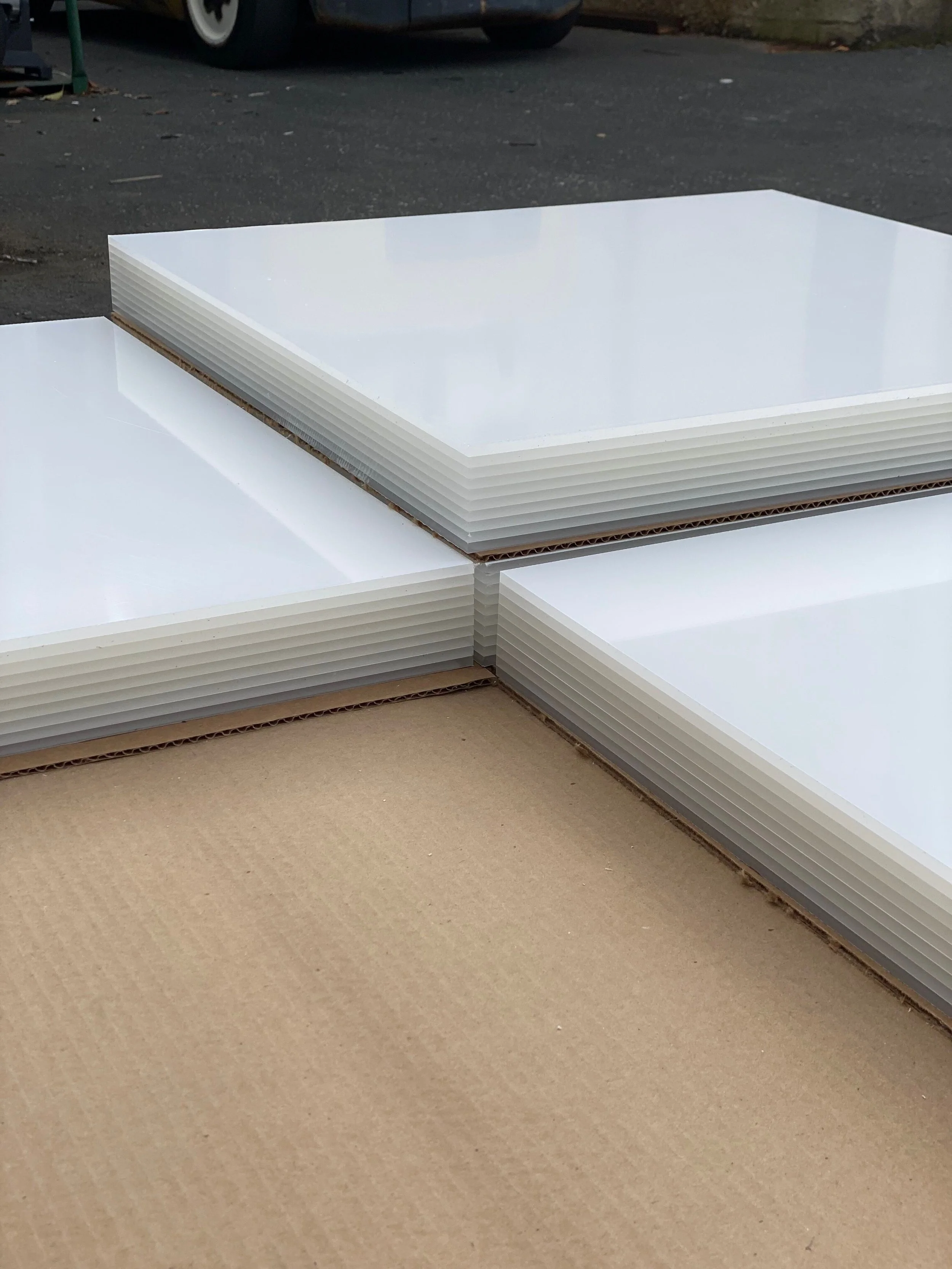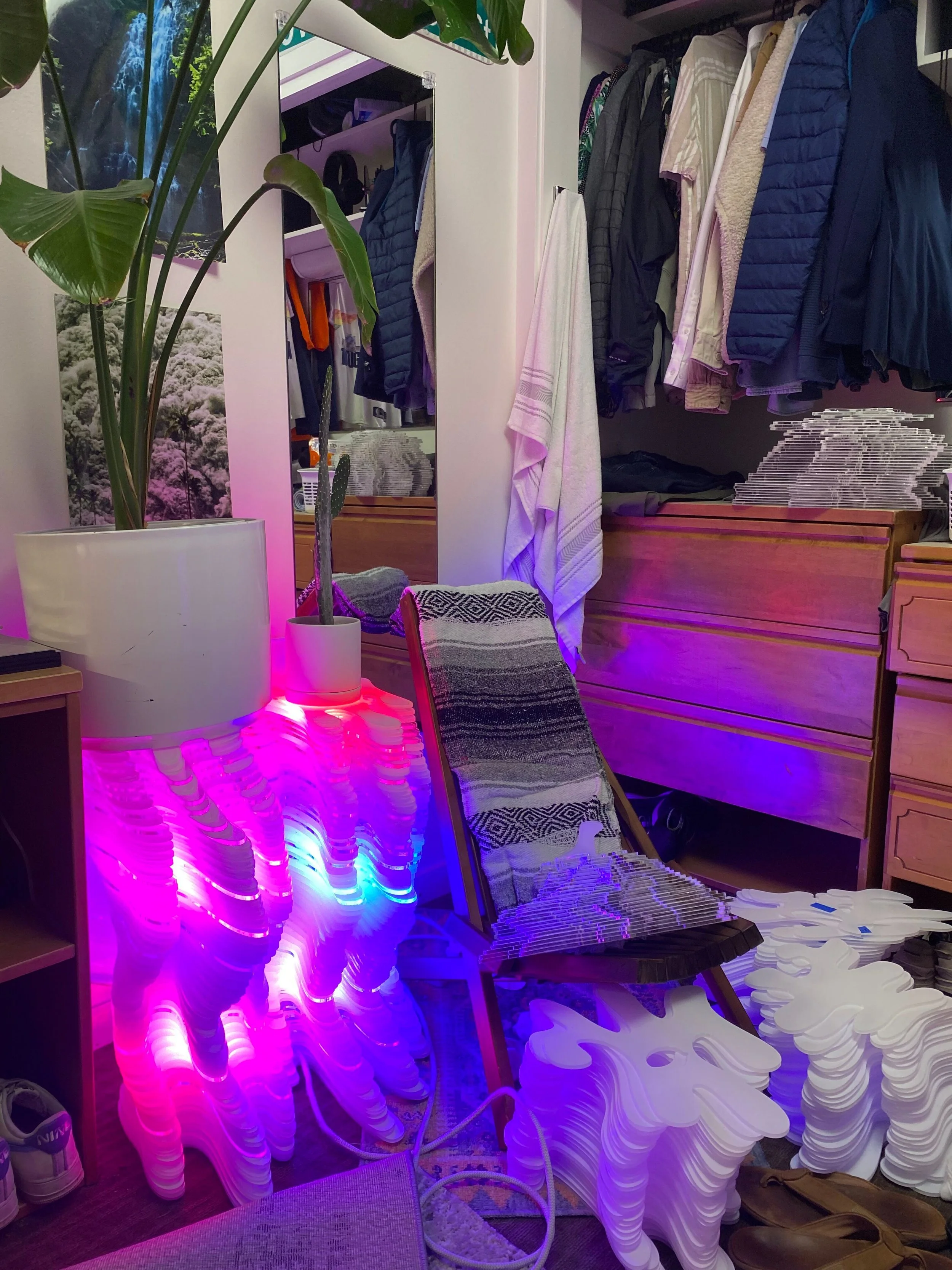 Mirage - FXMSculptural lighting feature contracted by Stanford Fashion X Market containing over 200 individual panes of acrylic. This piece was inspired by the natural beauty of the Cholla Cactus and Blue Ridge Coral.